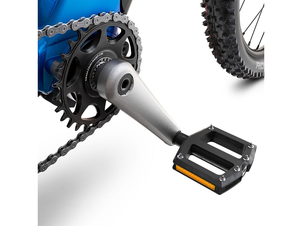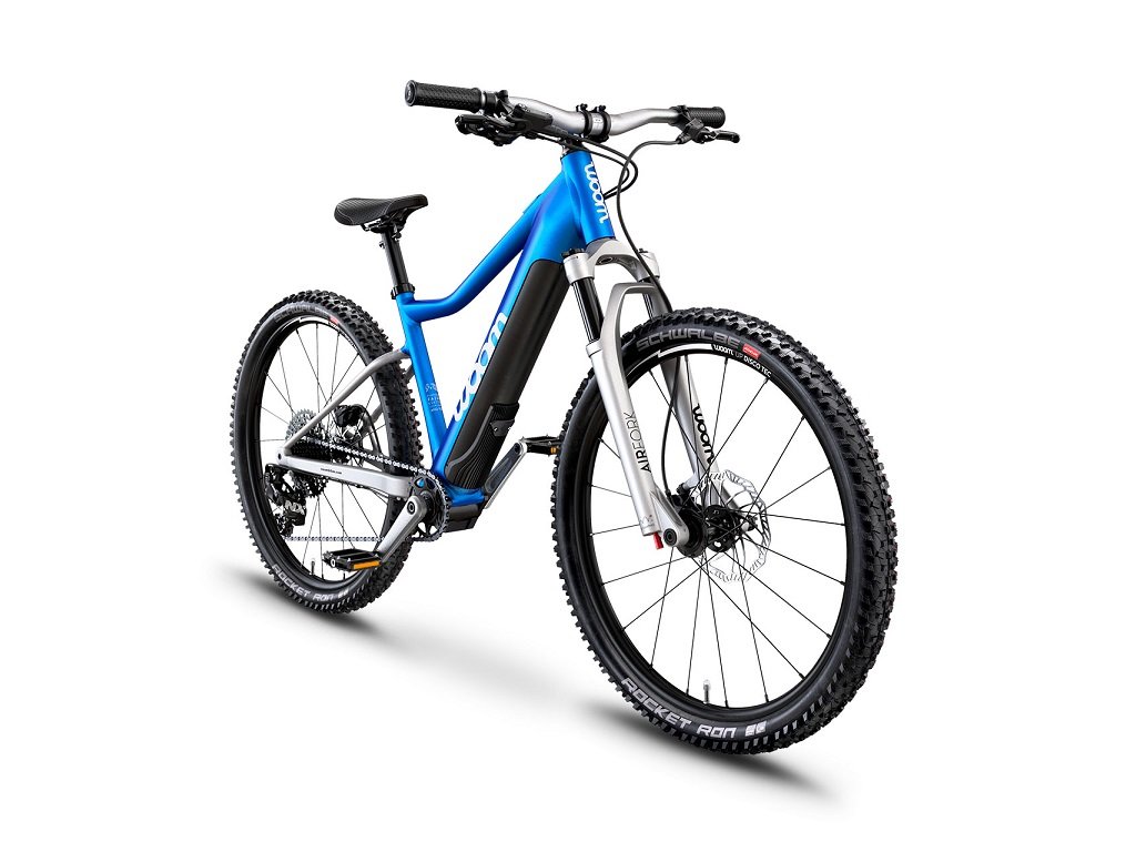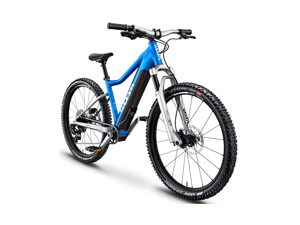 Dětské horské elektrokolo WOOM UP 6. Toto kolo má 26" kola, přední odpruženou hydraulickou vidlici a je určen pro děti od 10 let a přibližnou výškou zhruba 140 cm. Váha kola s baterií a motorem je 16,6 kg a bez baterie a motoru jen 13,3 kg. WOOM UP 6 má kotoučové brzdy, 11-stupňovou přehazovačku Sram a motor Fazua 250 W. Elektromotor má omezovač výpomoci na 20 km/h. Při vyšší rychlosti se elektromotor vypíná. Z rámu lze během chviličky vyjmout elektromotor i s baterií a získat tak normální horské kolo.