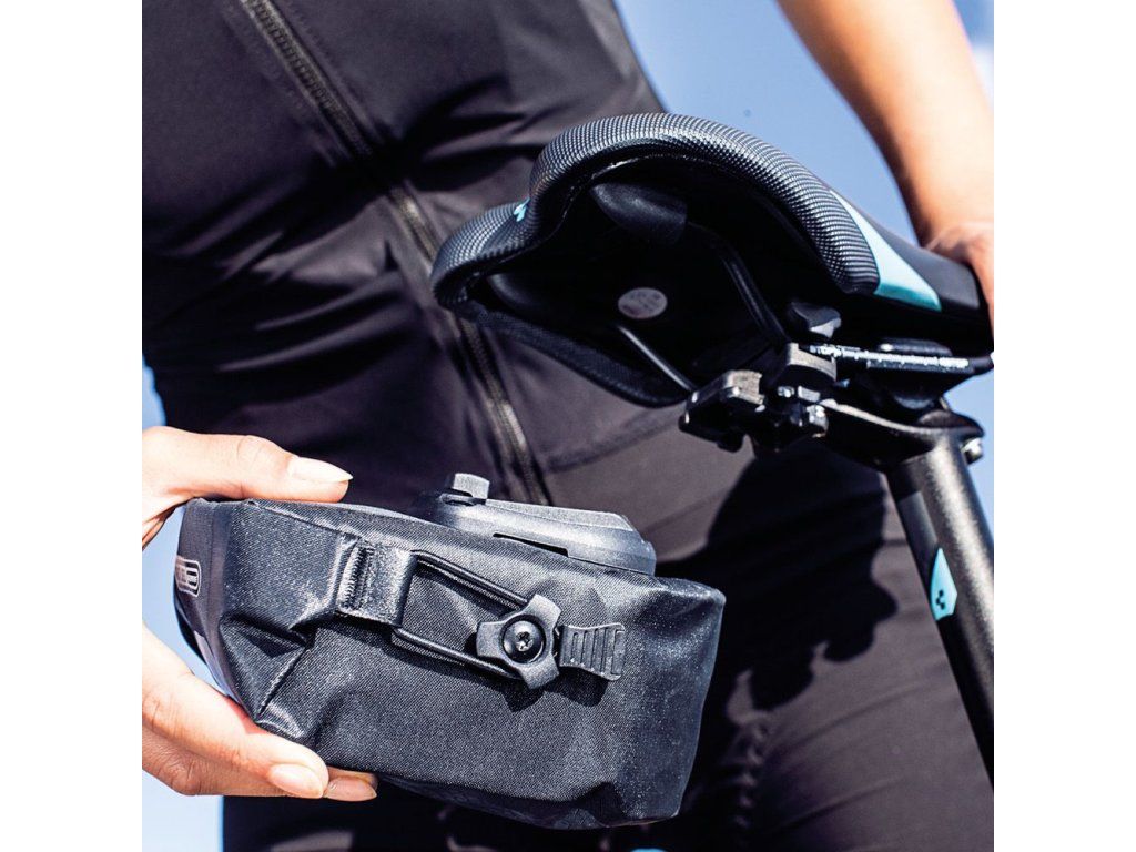 K tomu je brašna navíc vodotěsná a nabízí dostatek prostoru pro všechny nezbytnosti, jako je duše, multiklíč, lepení, případně i jednoduchou lékárničku. Zavírá se rolováním což znamená, že můžete snadno zmenšit její objem v případě, že ji nenaplníte celou. K sedlu nejprve přimontujete upínací systém a do něj pak už jen rychlým zatlačením zasunete brašnu. Opačně to jde stejně rychle. Celý způsob upevnění je už otestován dlouhými roky používání, a protože zůstal stejný, můžete si Micro TWO připevnit i na kola se starým upínacím systémem na sedle. Kompatibilita zůstala zachována.