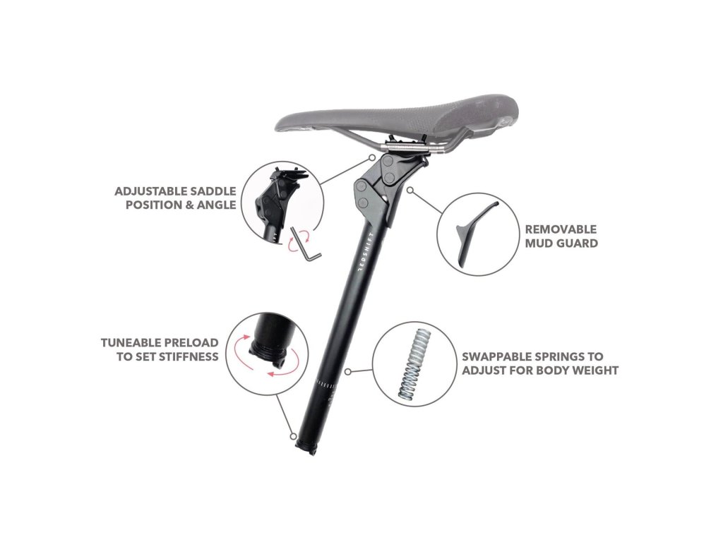 Revoluční odpružená sedlovka Redshift využívá důmyslný systém paralelogramů a pružin jejichž předpětí se dá uživatelsky nastavit. Dosáhnete tak přesné tvrdosti, jakou vyžadujete. Pro těžší váhy je pak k dispozici doplňková sada pružin.